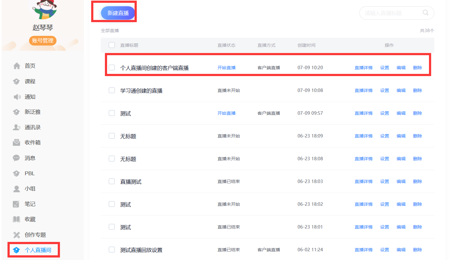 学校网络教学平台若无“个人直播间”,请联系商务经理配置。