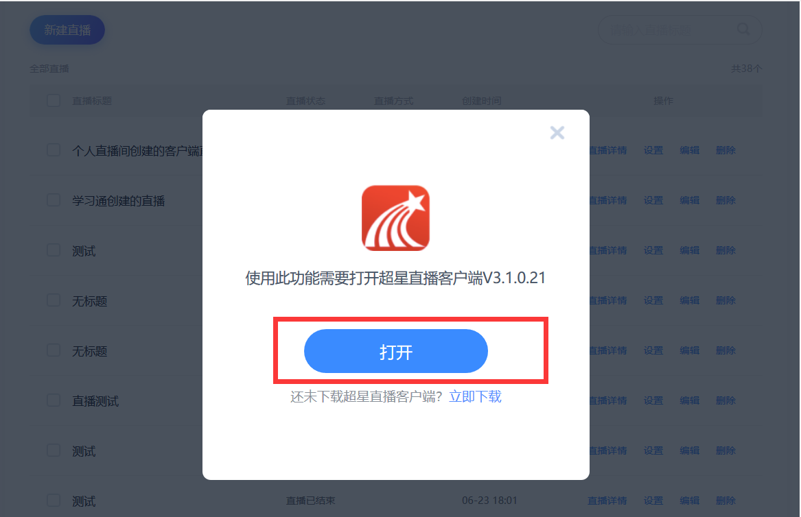 然后点击“开始直播”从“超星直播客户端”打开开始直播。