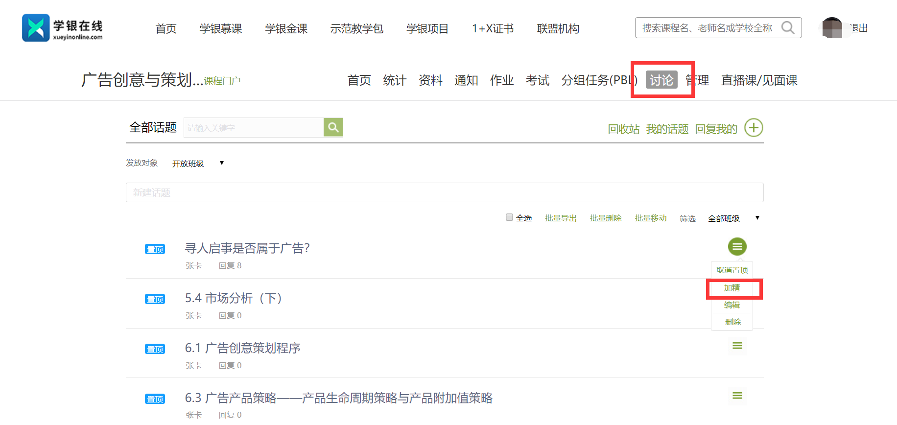 师生互动:来源于课程讨论区加精帖,可加精优质讨论帖显示在门户师生互答。尤其是课程负责人相关优质帖可加精并置顶,从而优先显示在师生互动;