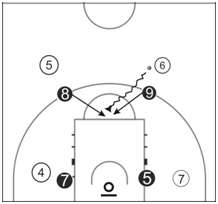 “关门”配合是临近的两个队员靠拢协同防守突破的配合。配合要点:在防守队员积极堵截持球队员的突破路线的同时,临近突破一侧的防守队员要及时快速地向同伴靠拢进行“关门”配合。易犯错误:“关门”的行动不统一,“关门”不紧,给突破者留有空隙通过;“关门”配合成功后,回防自己的防守人的速度要快。